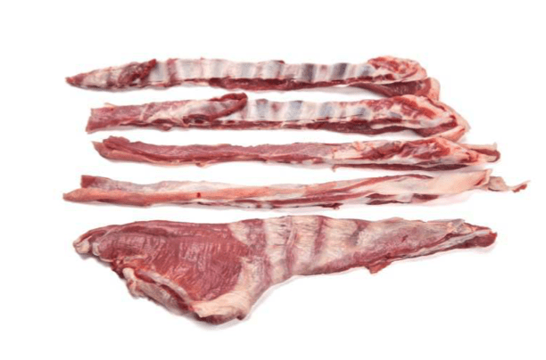 Se obtiene al realizar un corte perpendicular a las costillas por la parte baja de las mismas incluyendo en el corte una parte de la falda. De cada medio cordero se obtienen unas 3 o 4 tiras.